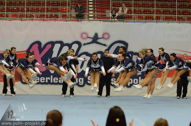 XMasCup 2011 vs Blue Pearls, Pretty Pearls, Mini Pearls und Shiny Pearls von den Dresden Monarchs, CATWALK, Kiddy Cats, Lunicats, LCV Dancer und DMC vom Lunatics Cheerleder e.V., Leonids und Cheeky Lionettes von den Leipzig Lions, Black Lions, Blue Monties, Black Maniacs und Dancing Maniacs vom CVV CheerMANIA Auerbach e.V., FlipBeez, FreeMotion und Showcolate vom SC DHfK Leipzig, Golden Dynamites, Dynaminis und Dynamix vom Cheerleader verein Dresden, Sweet Angelz, Junior Angelz, Crazy Angelz und White Angelz von Angelz Cheerleader Plauen, Wild Up von ETC Crimmitschau, FOC Four One Clover vom BV Chemnitz 99, Move it Peewees und Move it Juniors vom Move it e.V. Erfurt, MJ`s5 vom ZFC Meuselwitz, Blizzards und Calling 112 vom SpVgg Spitzgrund 72 e.V., Plantastics, Dancing Leaves SR und Dancing Leaves JR vom SV Grün Weiß Mohsdorf, Little Arrows vom Arrows Pirna e.V., Peaches Juniors GS vom The Peaches Cheerleader Zwickau, SG xyztitle the flying V aus Riesa am 3.12.2011 in Dresden - Margon-Arena, Football - Bilder vom Spiel